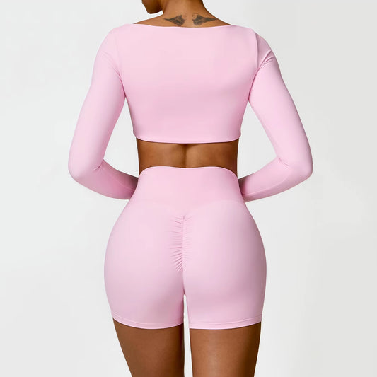 Uzun Kollu Crop Büzgü Biker Şort Takım